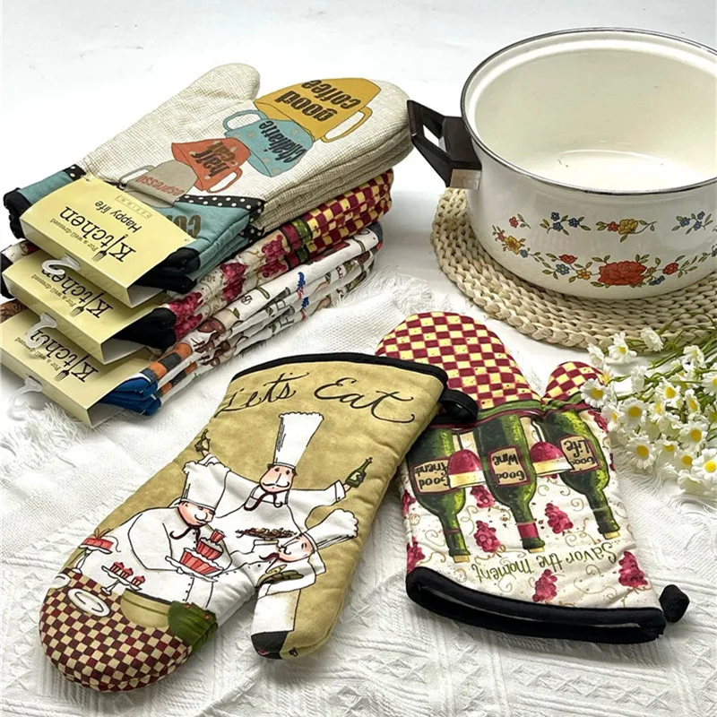 2Pcs 17x33cm Cotton Vintage Printed Oven Mitts Baking Gloves Pad Microwave Insulation Kitchen Tool Party Gift