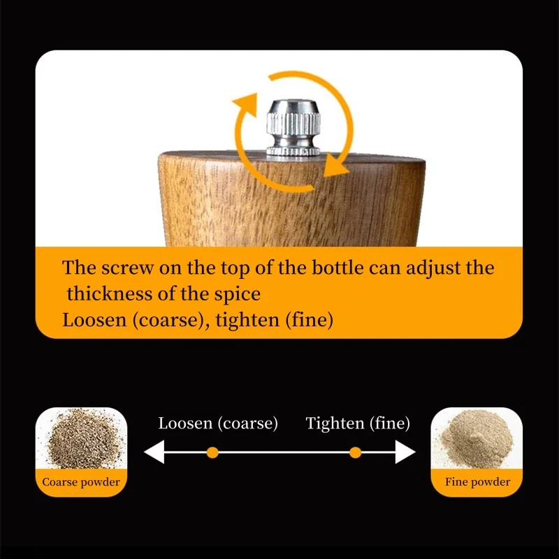 Adjustable Grinding Levels - These salt grinder pepper mill with adjustable ceramic grinding core, you can easily adjust the grind grade in them from fine to coarse by twisting top nut. Rotate clockwise for fine grind and counterclockwise for coarse grind.