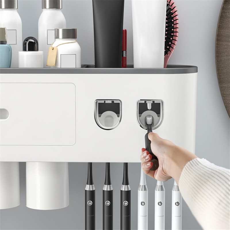 Automatic Toothpaste Dispenser Magnetic Toothbrush 2 Cups Holder 6 Toothbrush Hocks (2 Dispenser 2 Cups)