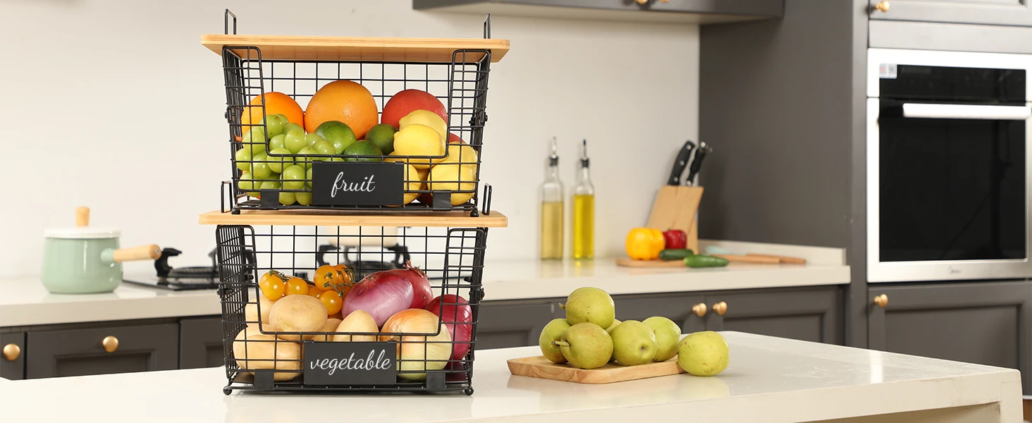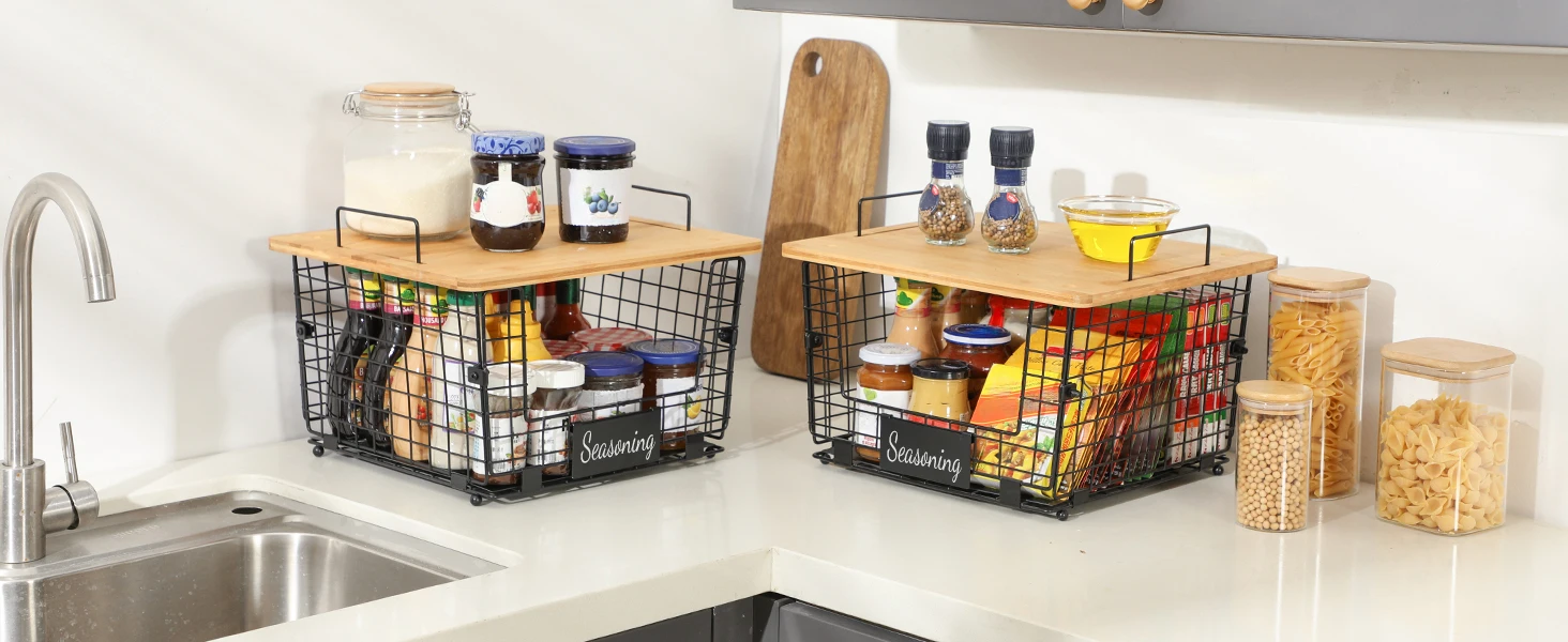 Large Stackable Wire Basket with Bamboo Top - Kitchen Counter, Pantry Organizer and Storage, Onion Potato Fruits Vegs Basket
