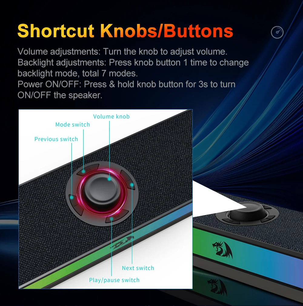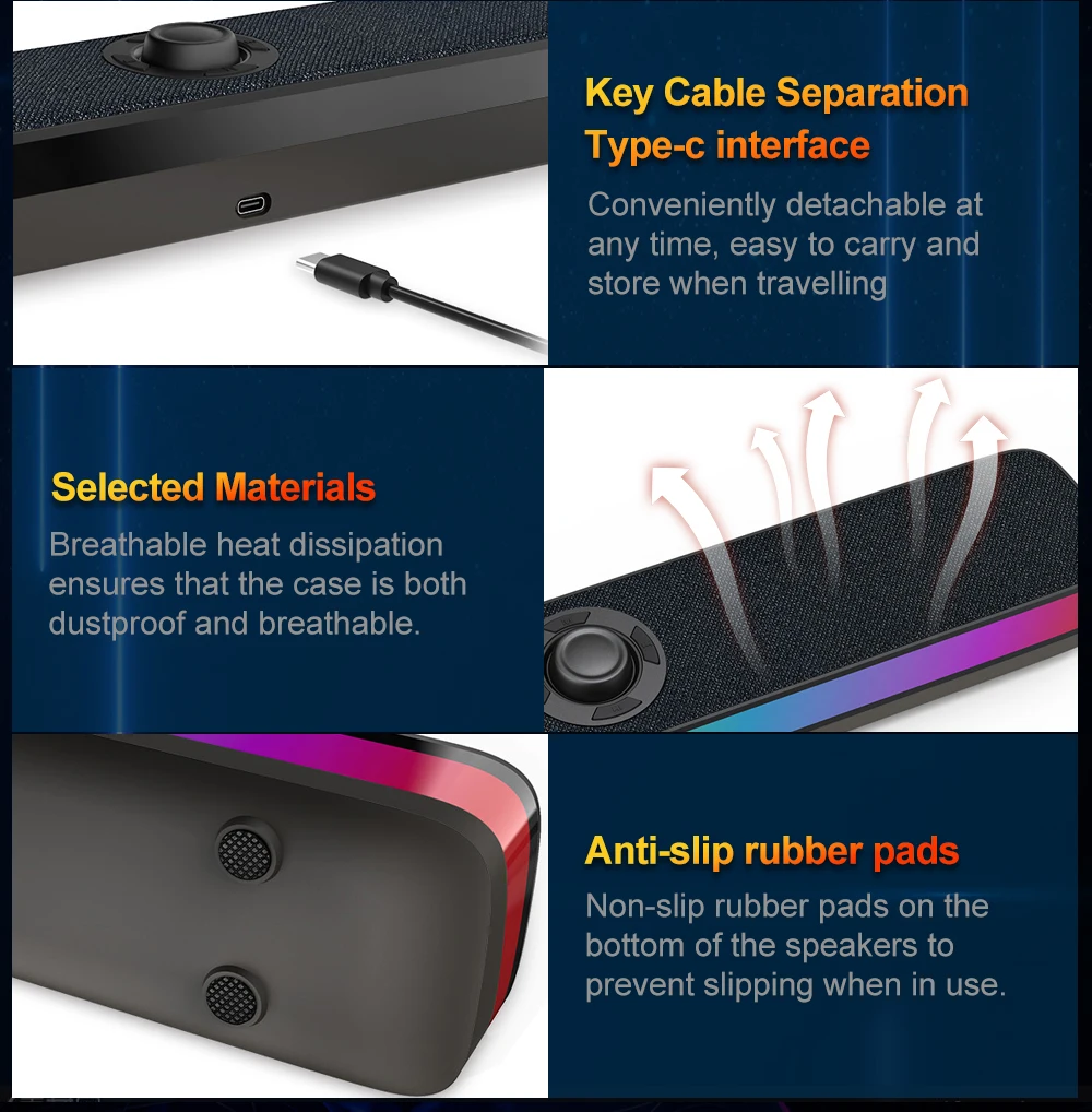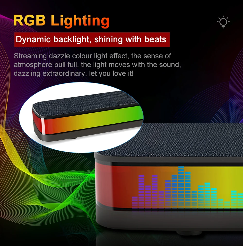 Light Up Your Space: Enhance your visual experience with 6 preset RGB lighting modes in our stereo speakers. The captivating lights add an extra level of immersion to your music or gaming sessions, creating a stunning ambiance.