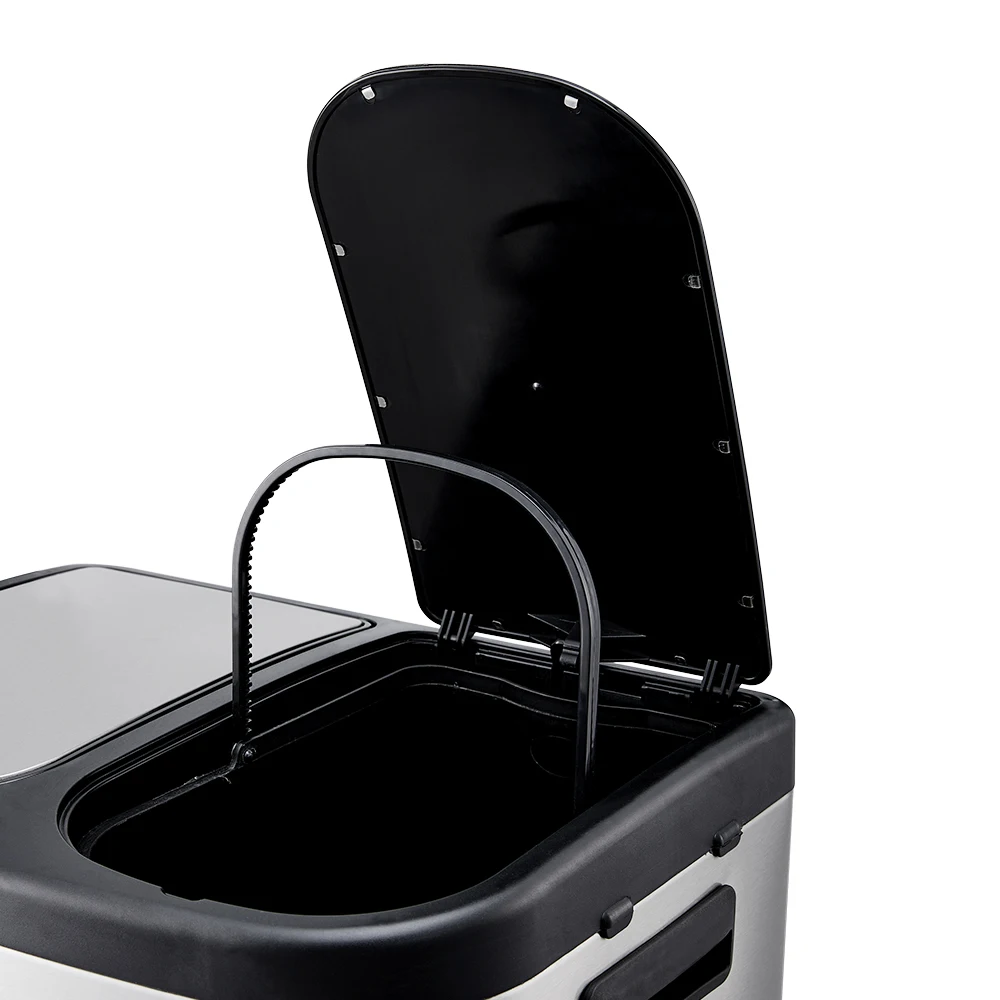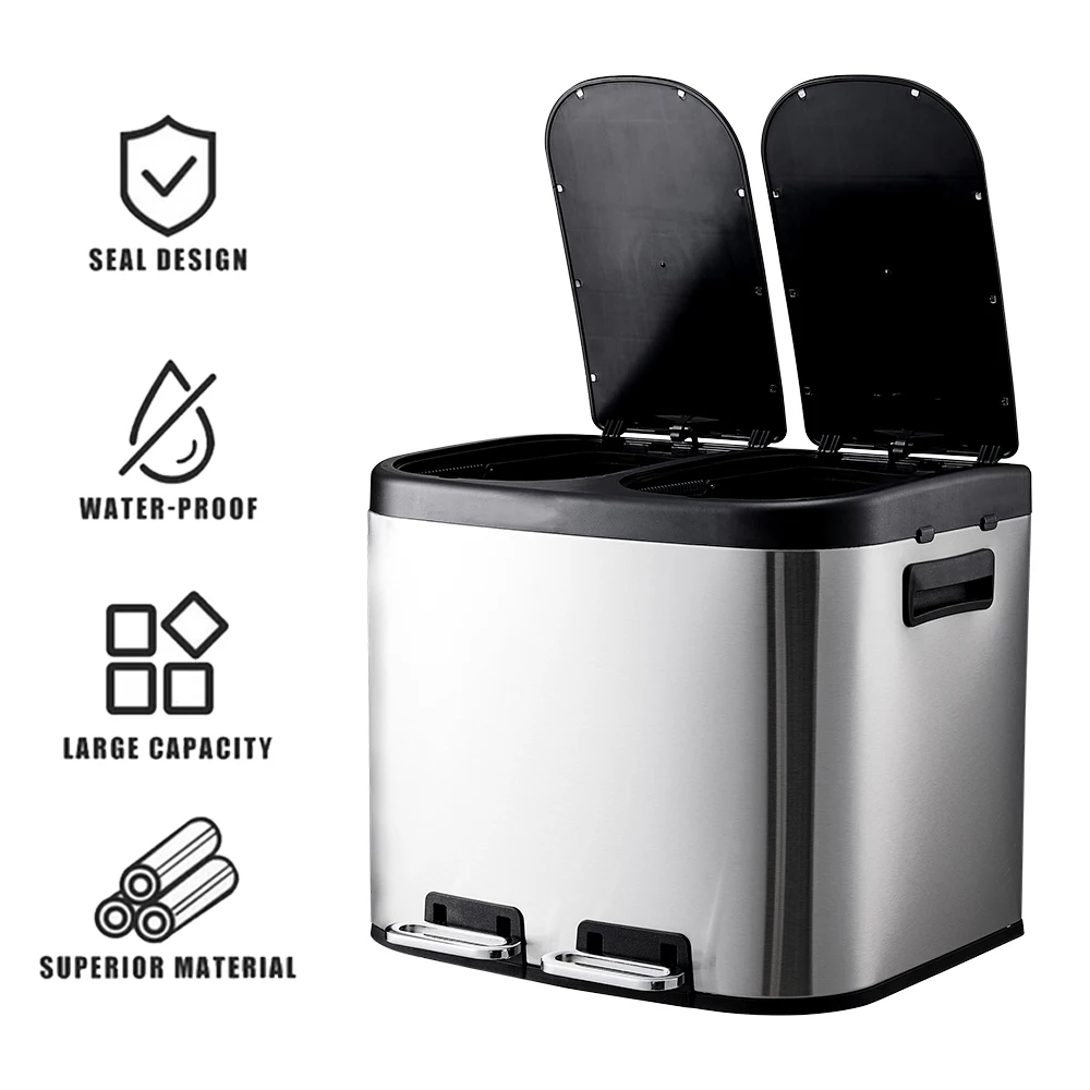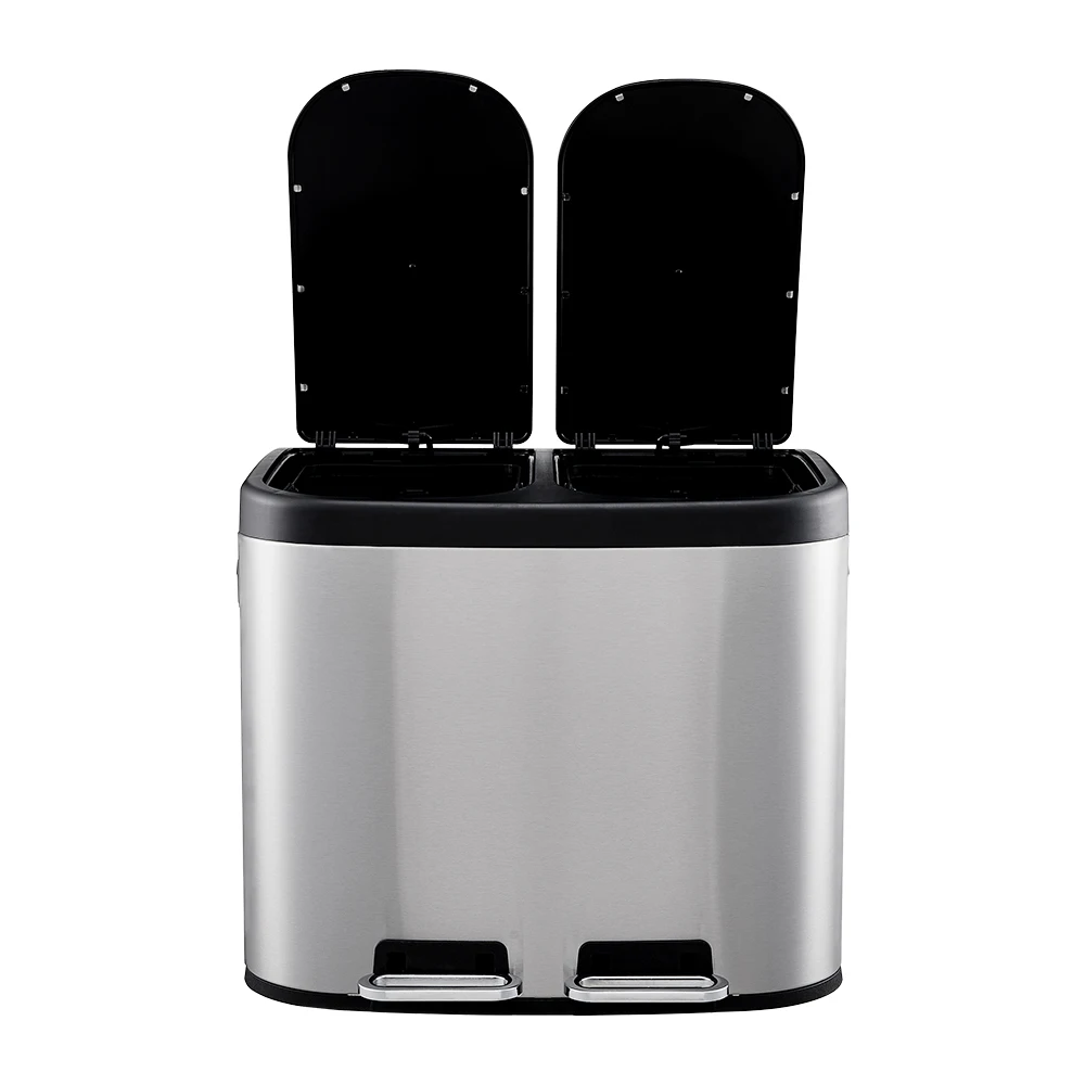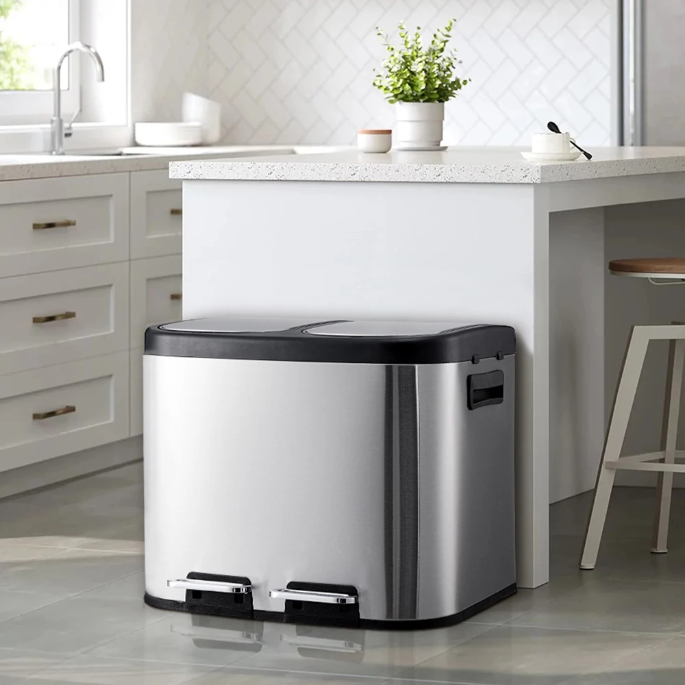 Discover convenience and cleanliness with our rectangular stainless steel trash can. Its compact and corner-friendly design allows it to fit seamlessly in offices and study areas without being an eyesore. Featuring two bins, you can do recycling with ease. Step on the pedals to open the lids, which also guarantee odour-free closure. Crafted from durable stainless steel, it resists smudge and fingerprints to offer easy maintenance. Enjoy a clutter-free space with this sleek and practical trash solution.
