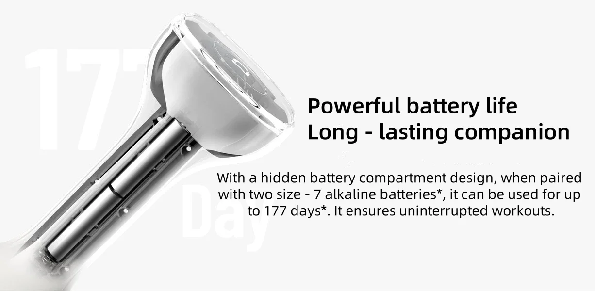 With a hidden battery compartment design, when paired with two size - 7 alkaline batteries*, it can be used for up to 177 days*. It ensures uninterrupted workouts.