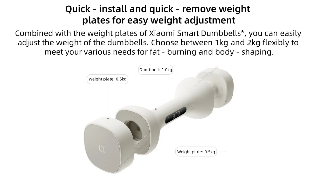 Combined with the weight plates of Xiaomi Smart Dumbbells*, you can easily adjust the weight of the dumbbells. Choose between 1kg and 2kg flexibly to meet your various needs for fat - burning and body - shaping.